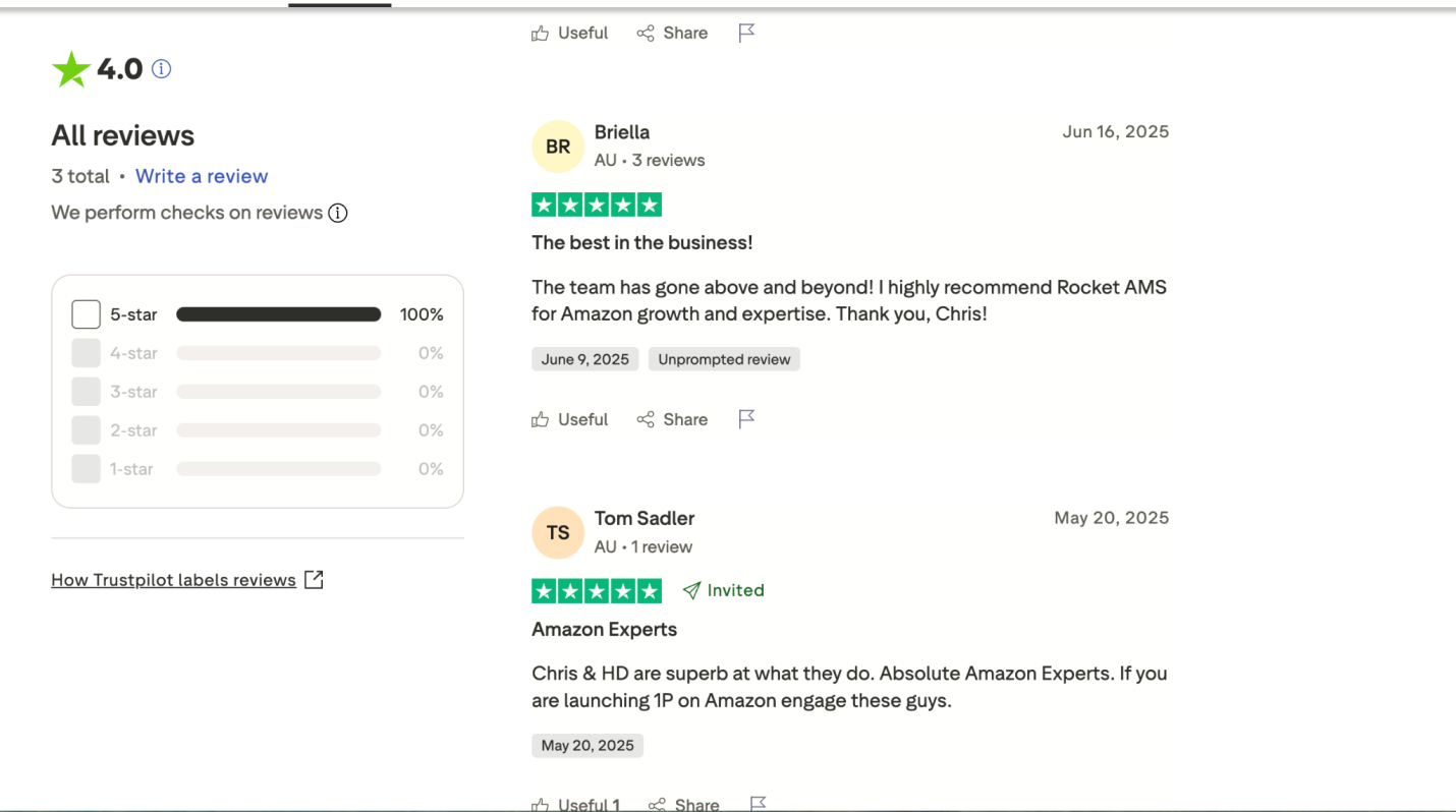 RocketAMS holds a 4.0/5 TrustScore (3 reviews) on Trustpilot. While the review volume is small, available feedback is strongly positive, with clients highlighting deep Amazon expertise, strong growth impact, and knowledgeable account leadership. Reviewers frequently describe the team as highly skilled and instrumental in improving Amazon performance and scaling marketplace growth.